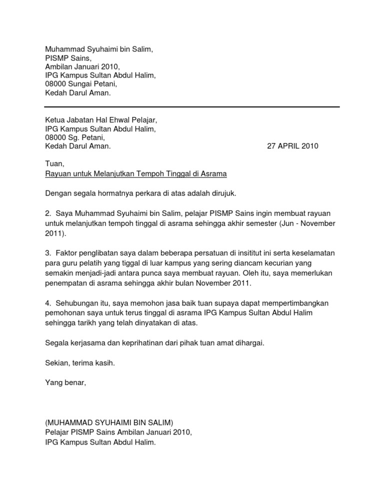 Surat Rayuan Untuk Tinggal Di Asrama Tahun 2020